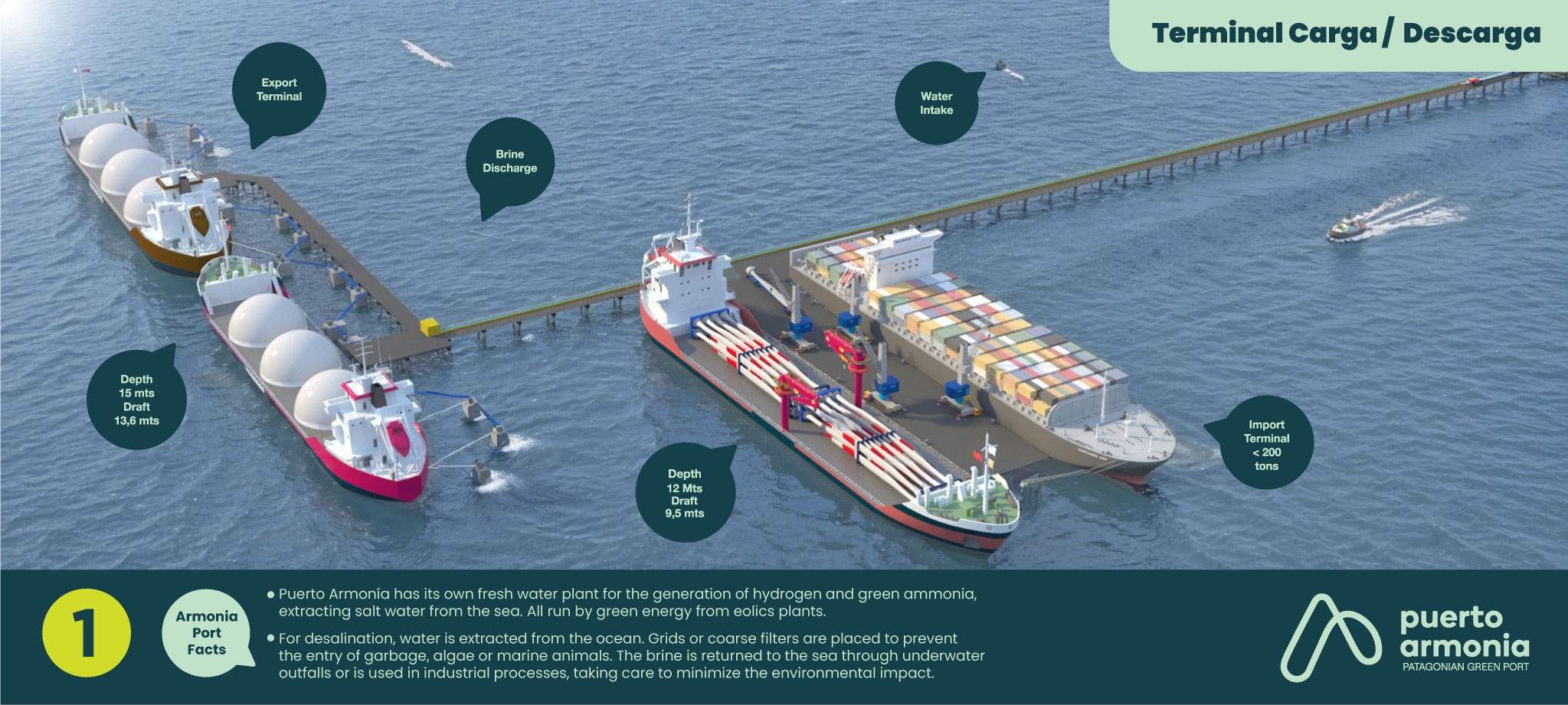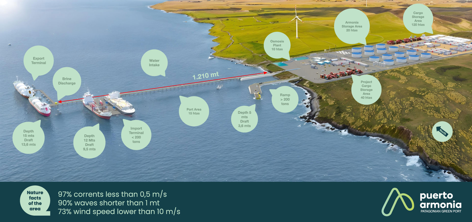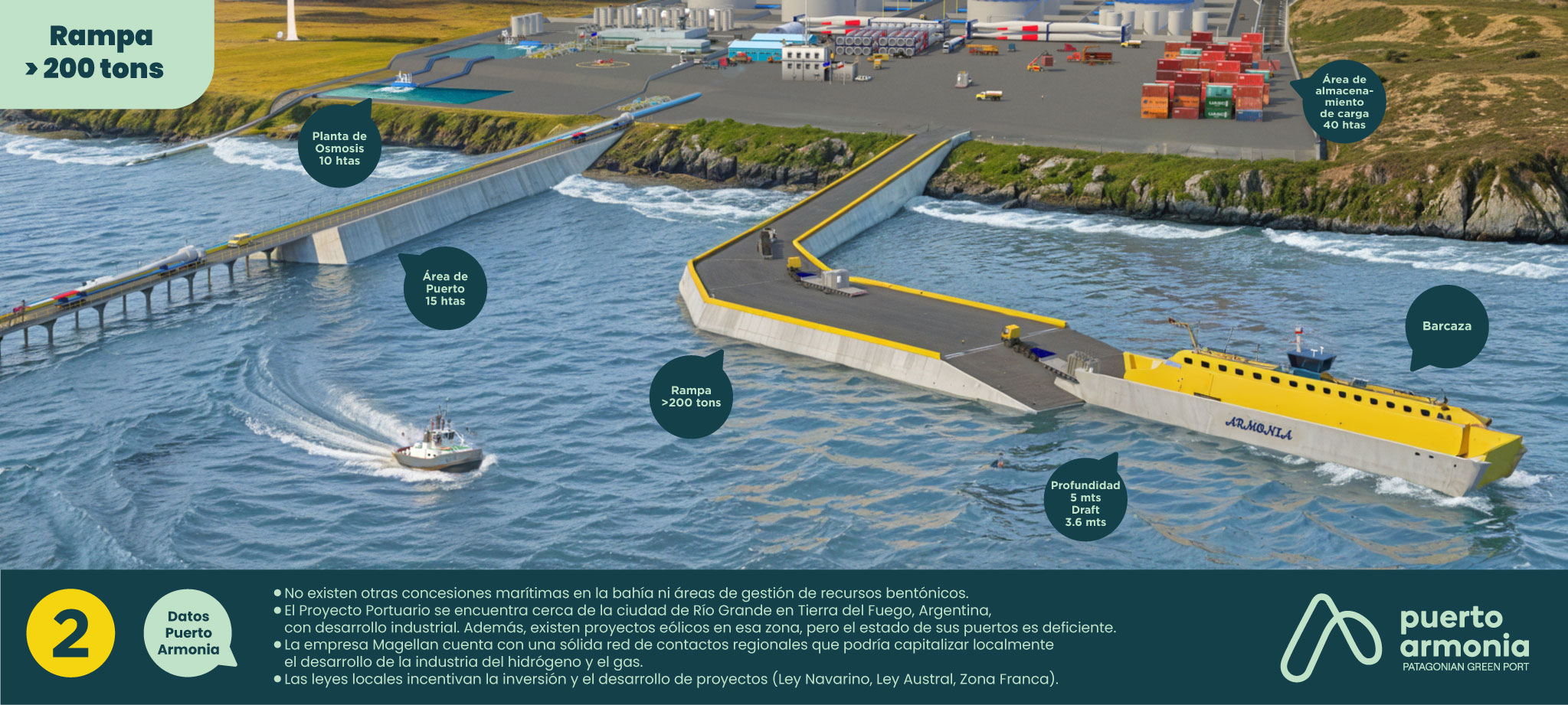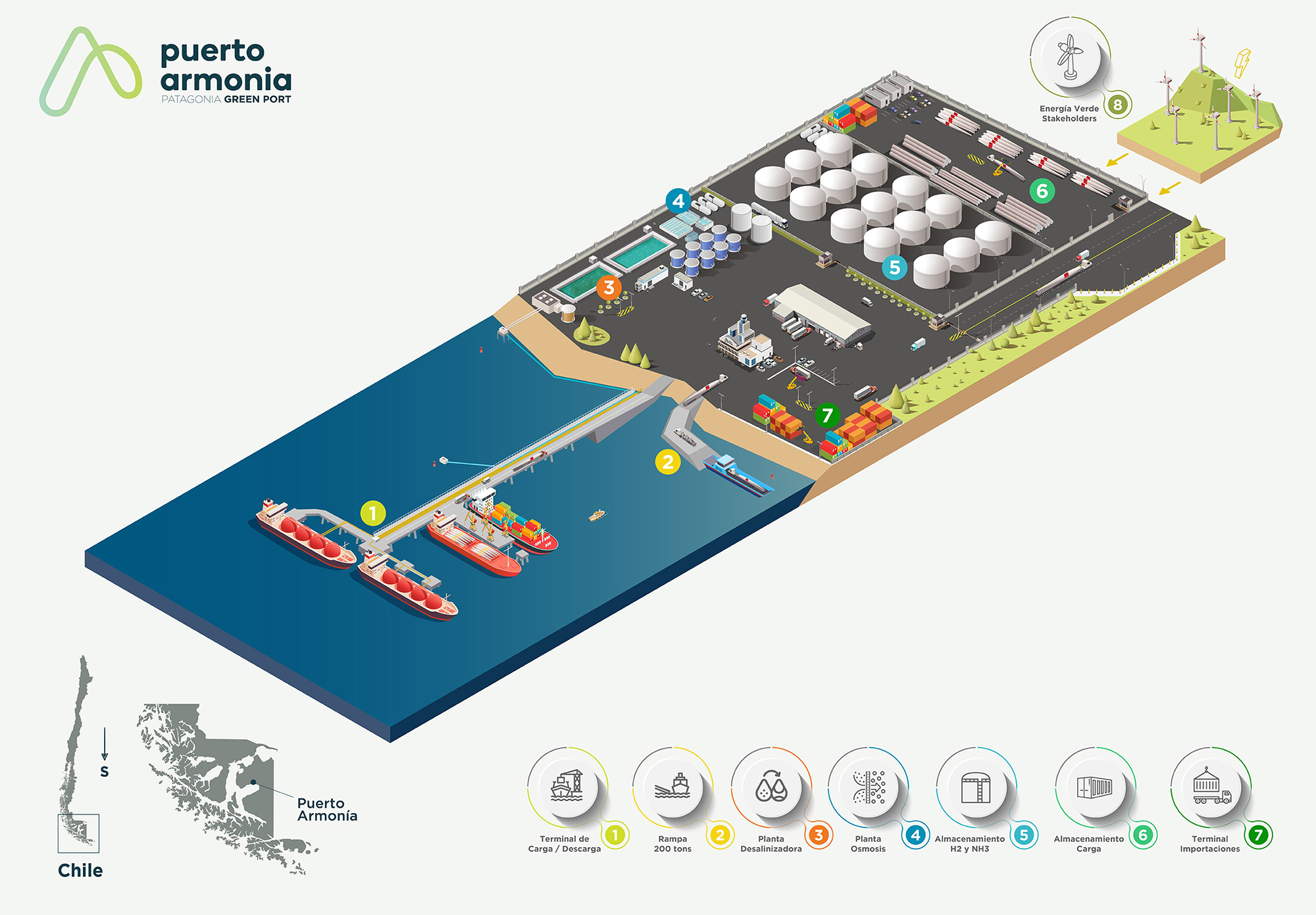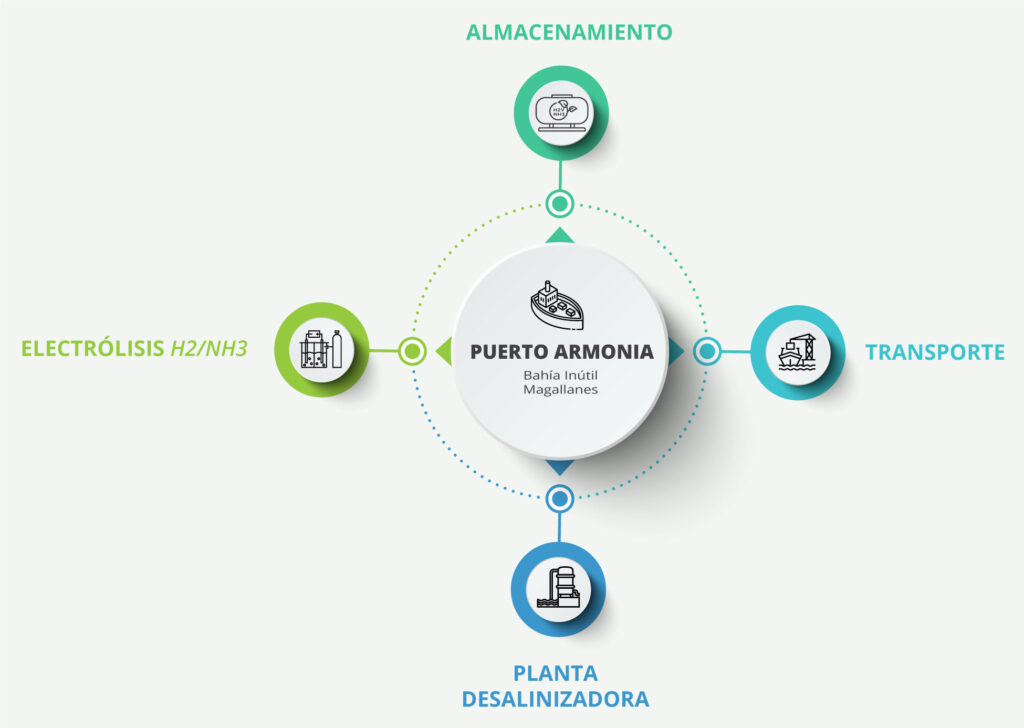 Es un proyecto portuario sustentable, concebido como un nodo logístico de escala internacional que integra producción, exportación y almacenamiento de hidrógeno verde (H₂V) y amoníaco verde (NH₃V)